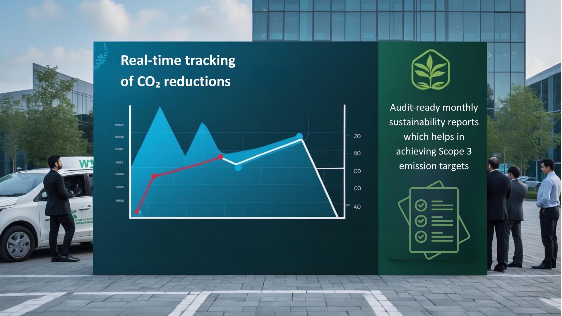 ESG and EV benefits are framed with verifiable baselines. The business case quantifies CO₂ reductions, EV utilization, and idle-emission savings using CO₂ dashboards, carbon reduction calculations, and EV fleet-operation reports. This allows ESG leaders and Finance to align on climate impact and to justify EV transition with both emissions and cost-per-kilometer evidence.