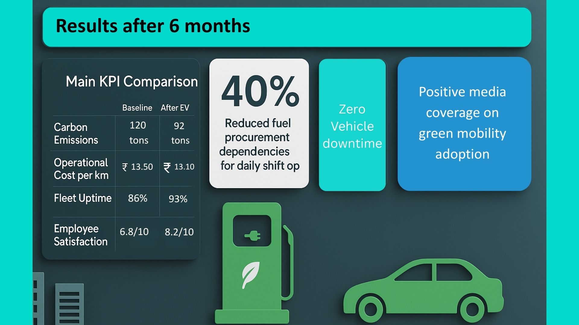 For EV or ESG‑linked programs, the model separates “green ambition” from operational reality. It uses vendor or OEM data on EV range, charging windows by shift pattern, and charger density to test EV/ICE hybrid mixes and identify routes or timebands where EVs can achieve uptime parity. It also links each scenario to emission intensity per trip, enabling later ESG reporting without inflating claims.