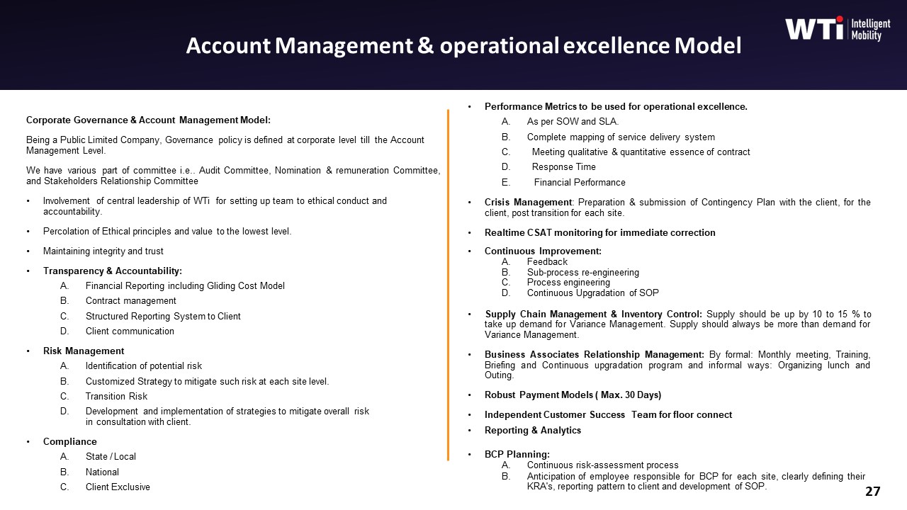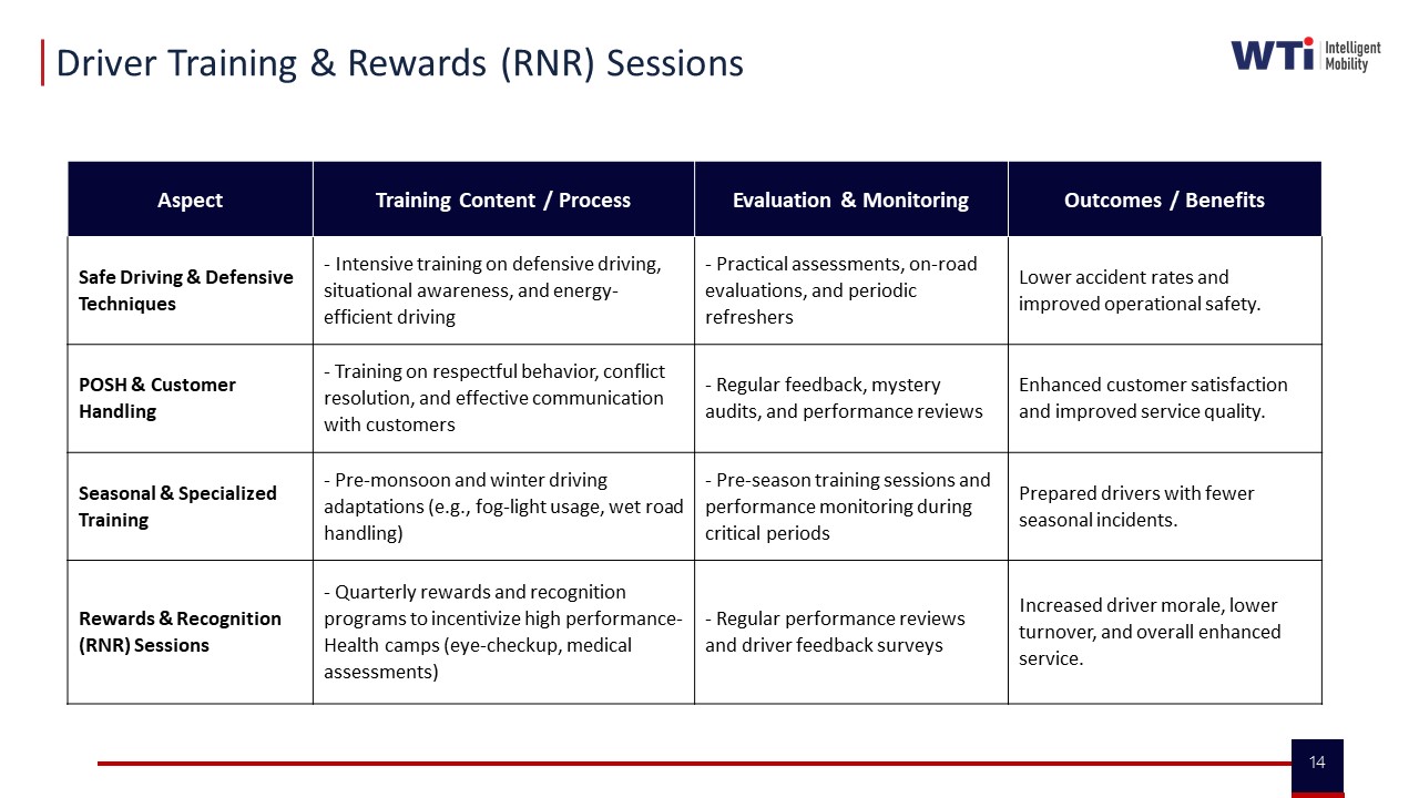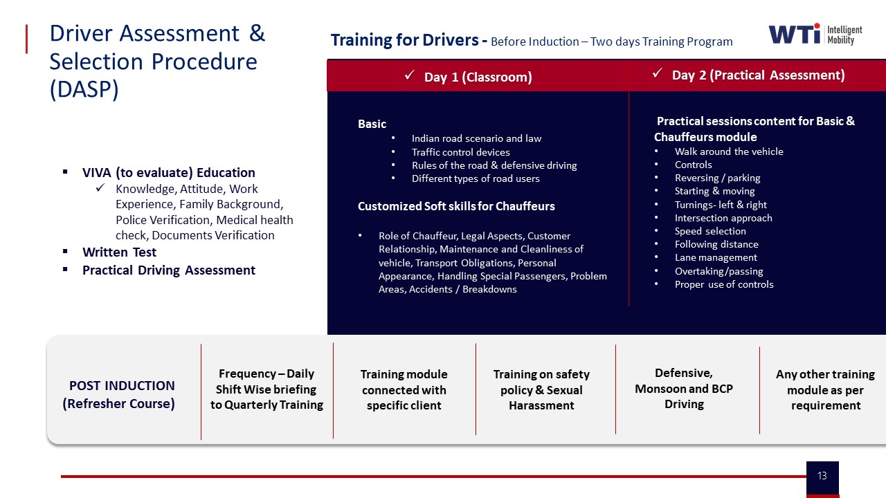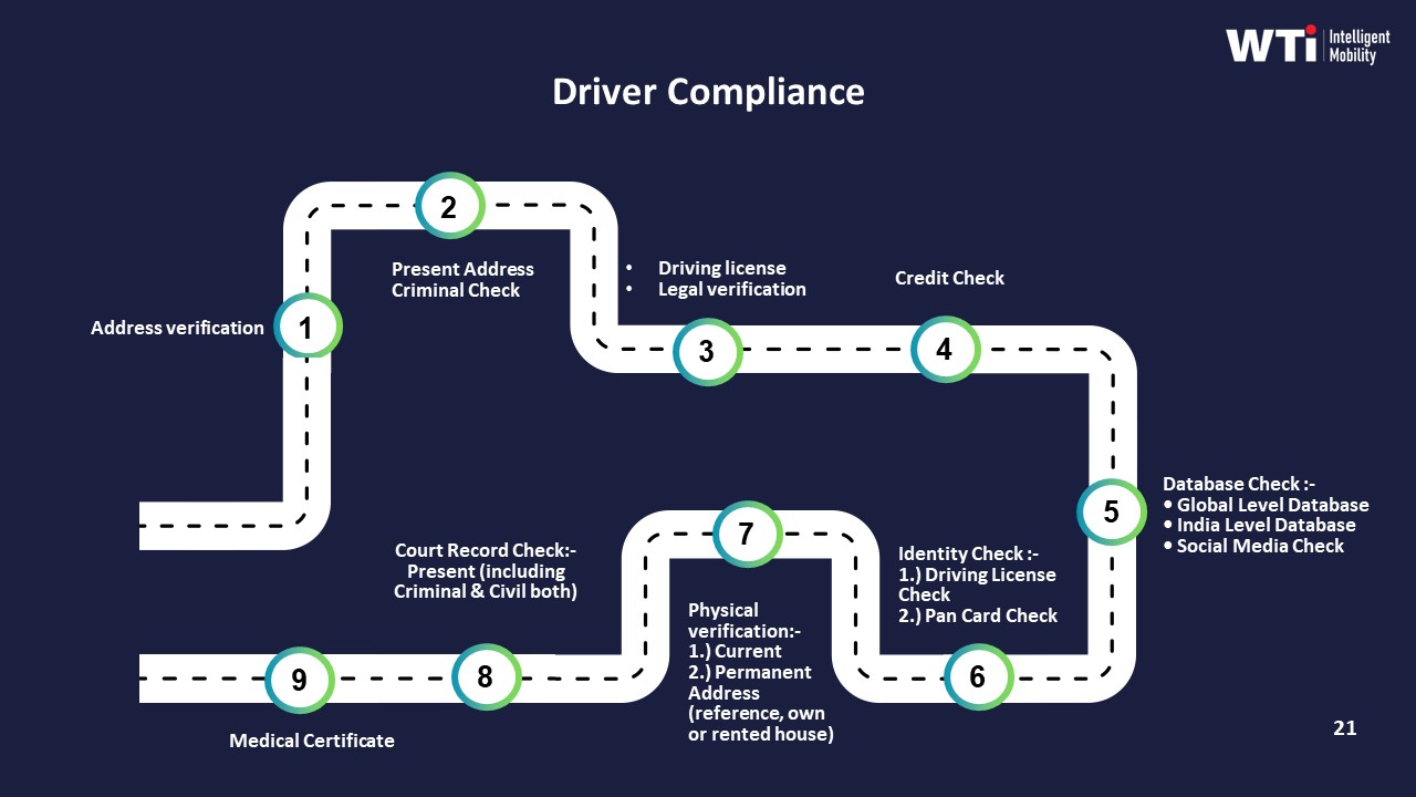 The most defensible reasons for driver rejection align with safety, compliance, and service reliability. Typical categories include failure of background checks or licence verification, repeated safety violations, tampering with GPS or IVMS devices, harassment or misconduct (especially with women or night-shift riders), non-adherence to route and escort protocols, substance use, and chronic SLA breaches such as repeated late reporting or no-shows. WTi’s collateral already describes deep driver vetting and training, women-centric safety protocols, driver compliance verification, and alert supervision systems, which can be used as objective baselines for these rules.