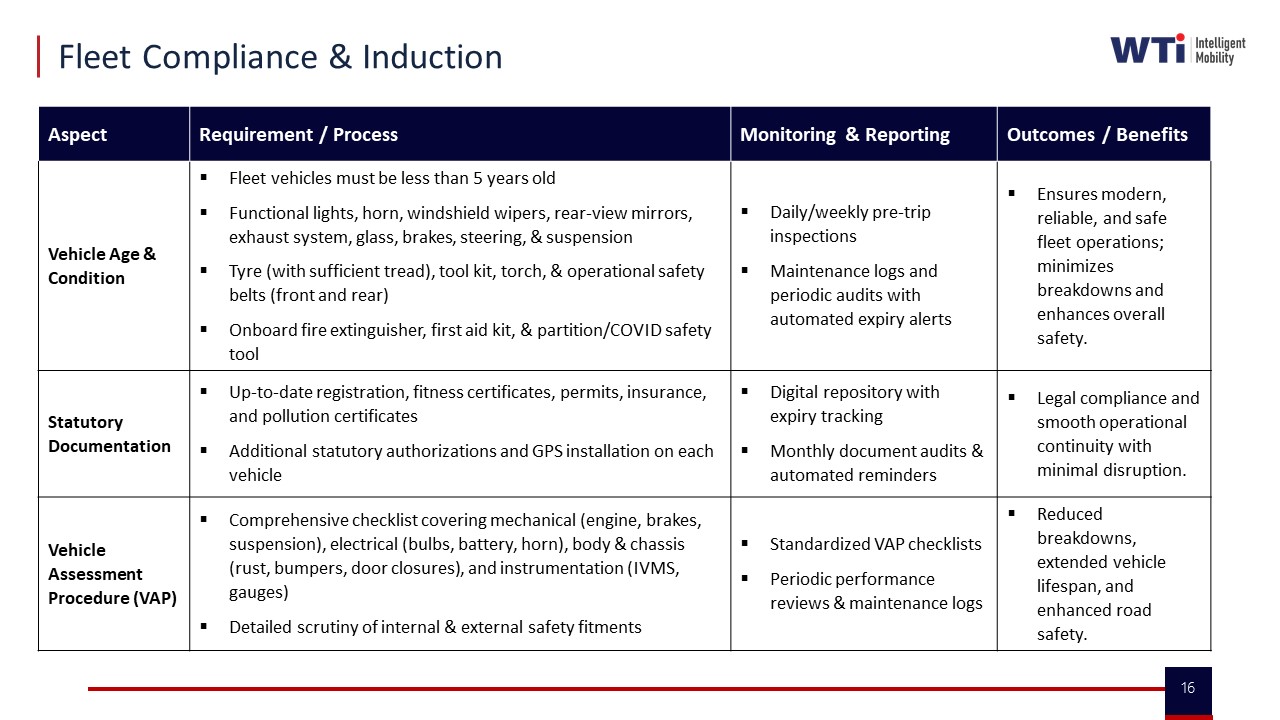 - Contracted fleet-compliance and induction criteria for age, documentation, and safety equipment.