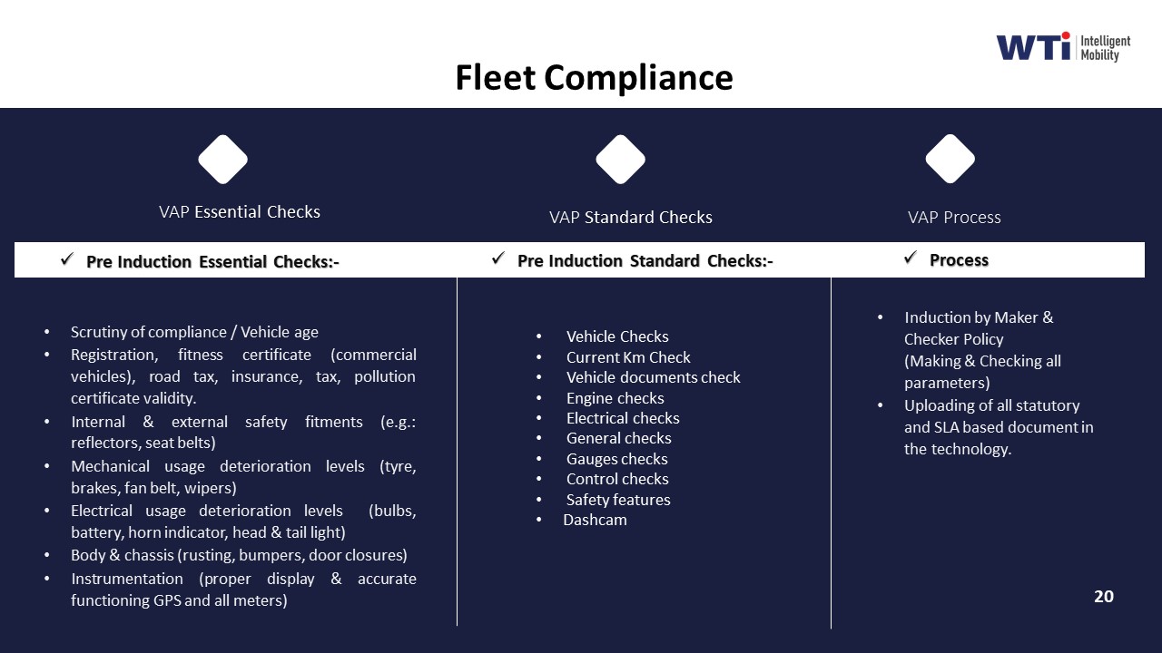 Procurement can require a documented Driver Assessment & Selection Procedure that includes VIVA, written, and practical tests, plus a defined background-check package covering address, criminal, license, credit, database checks, court records, and medical fitness. The driver compliance collaterals indicate a nine-step verification stack and a DASP framework, which can be converted into annexures and minimum onboarding standards. Contracts can mandate that no driver is rostered until all checks are marked “clear” in a centralized compliance management system with maker–checker controls and document upload logs.