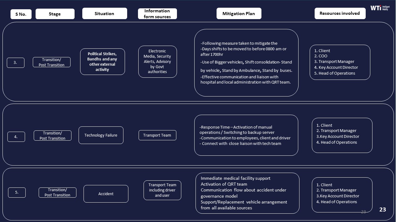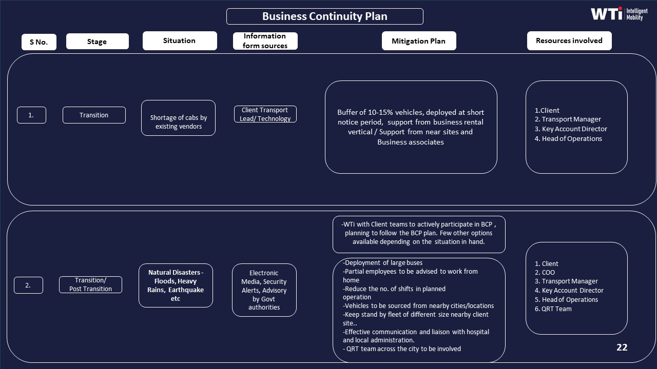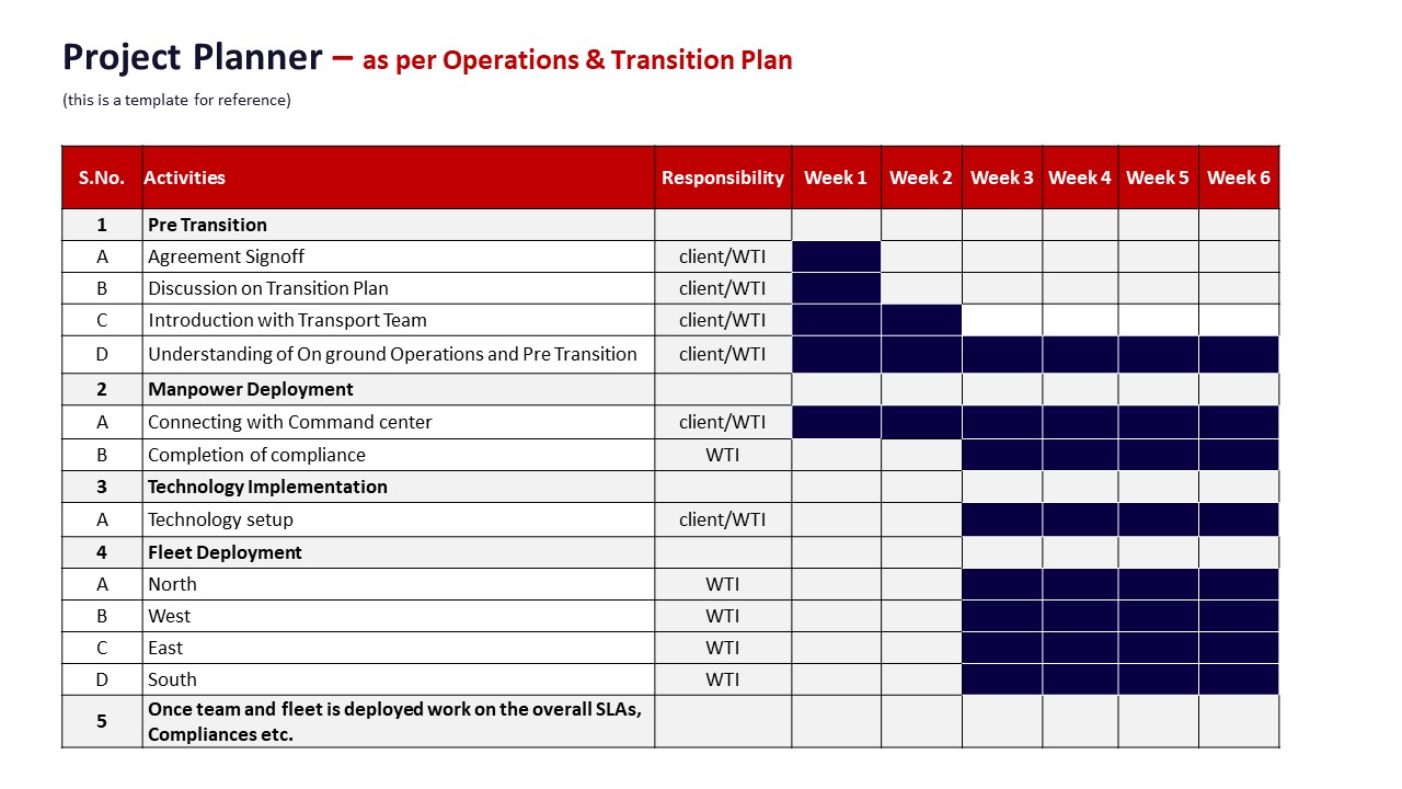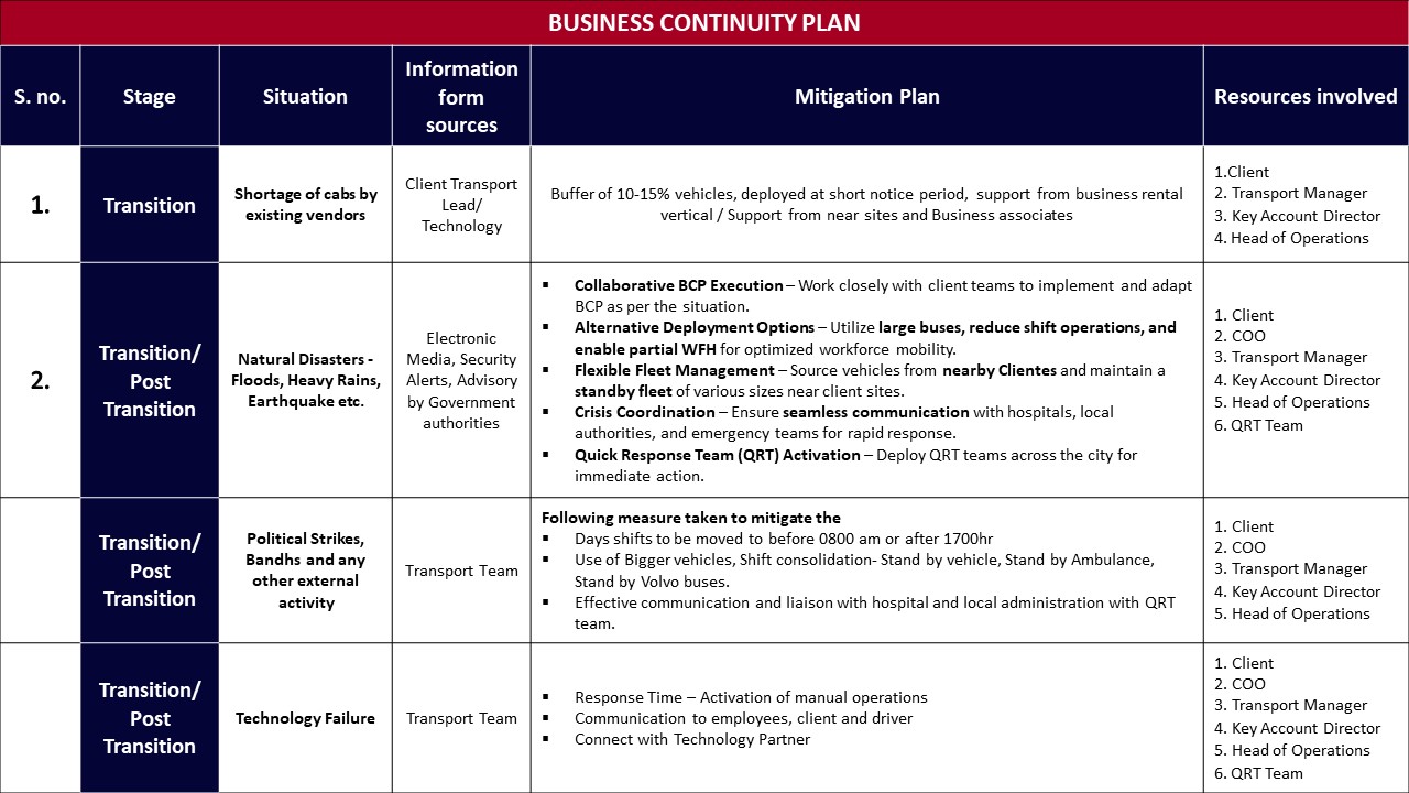 Corrective and preventive actions should then be defined in operational terms rather than generic assurances. Corrective actions may include immediate service restoration plans, temporary rerouting, or emergency vendor substitution under the business continuity plan and guarantee for uninterrupted services. Preventive actions may include revising spare‑capacity buffers for tier‑2 locations, altering the vendor mix, tightening alert thresholds in the command centre, refining women‑safety protocols, or updating the indicative transition or project planner for that geography. Each action should have an owner, deadline, and explicit KPI linkage, such as OTP, SLA breach rate, or Trip Adherence Rate.