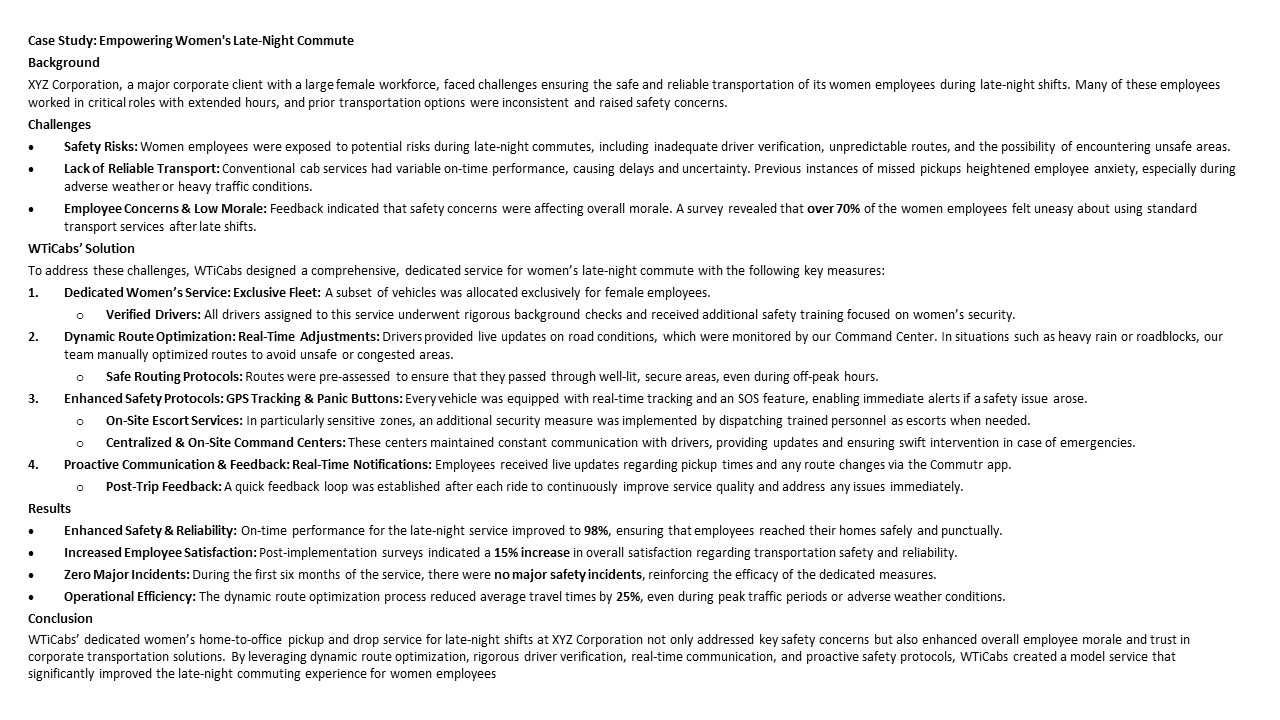 The strongest references come from companies with comparable night-shift density, women commuters, and hybrid rosters in the same tier‑2 or adjoining cities. These references are most useful when they confirm that centralized command centers, alert supervision systems, and local location-specific control desks consistently manage geofence violations, SOS triggers, and monsoon or strike-related diversions with high on-time performance. Case studies showing 98% on-time arrivals in severe weather, or 98% on-time and 15% satisfaction uplift for women’s late-night shifts, are powerful because they demonstrate real-world safety and reliability outcomes.