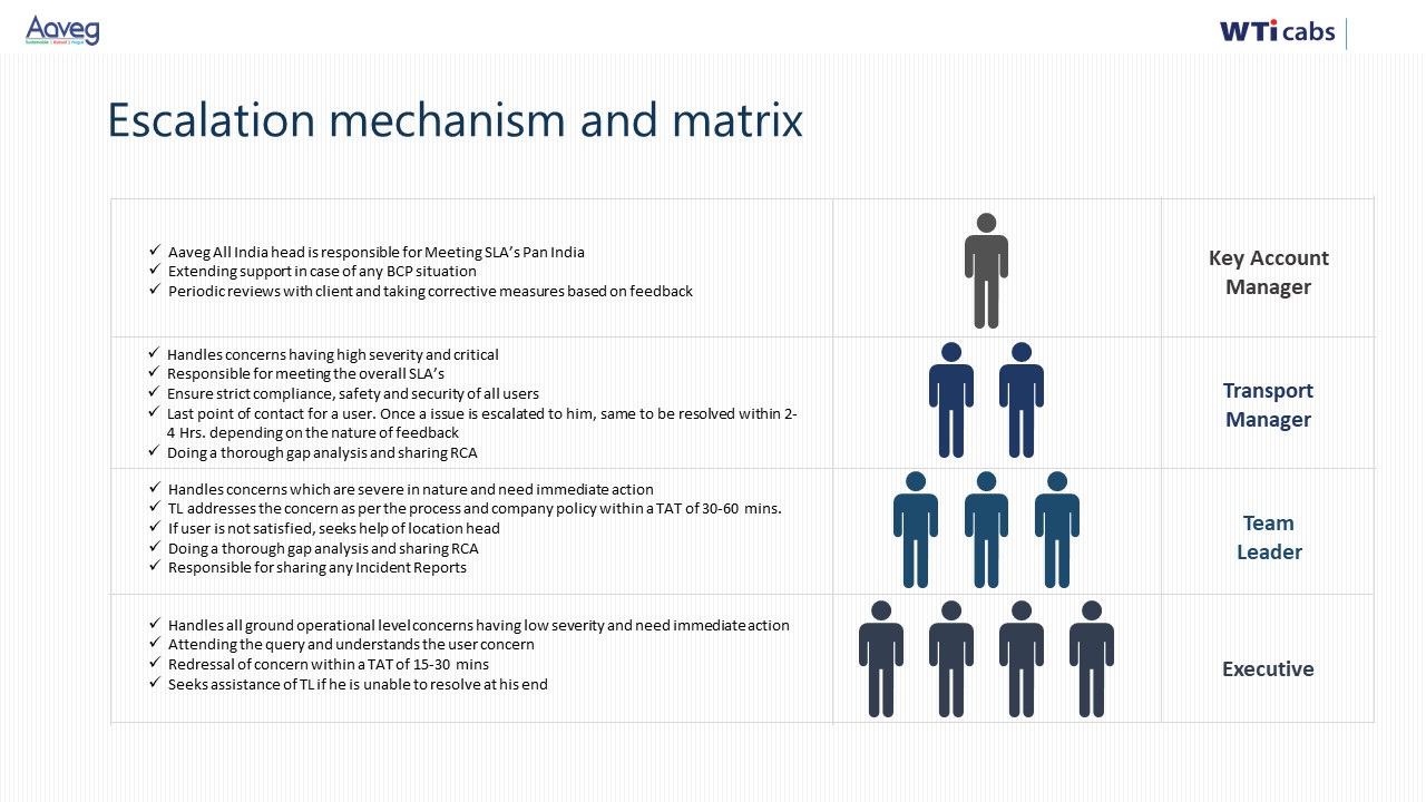 Unanswered escalation count should be tracked by shift, city, vendor, and category. The report must show median closure time, escalations breaching SLA, and repeated patterns by route or driver. This escalation view should align with the central command center logs and Business Continuity Plan playbooks so the transport head can intervene before patterns turn into reputational or safety incidents.