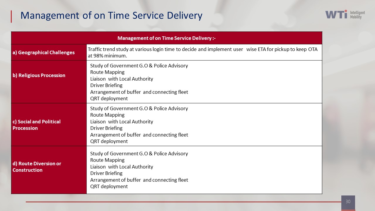 Second, control-room style observability should be used to trace each late pickup to an operational reason. The Transport Command Centre collateral shows how a centralized command center can correlate GPS traces, alert logs, vendor responses, and escalation workflows in real time. If repeated delays cluster around fleet shortages, non-availability of standby vehicles, or slow response to breakdowns in particular tier‑2 locations, then the density of partners, spares, and standby capacity is more likely the root cause than routing or app design.