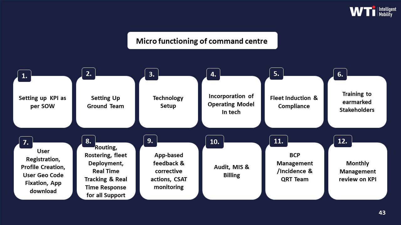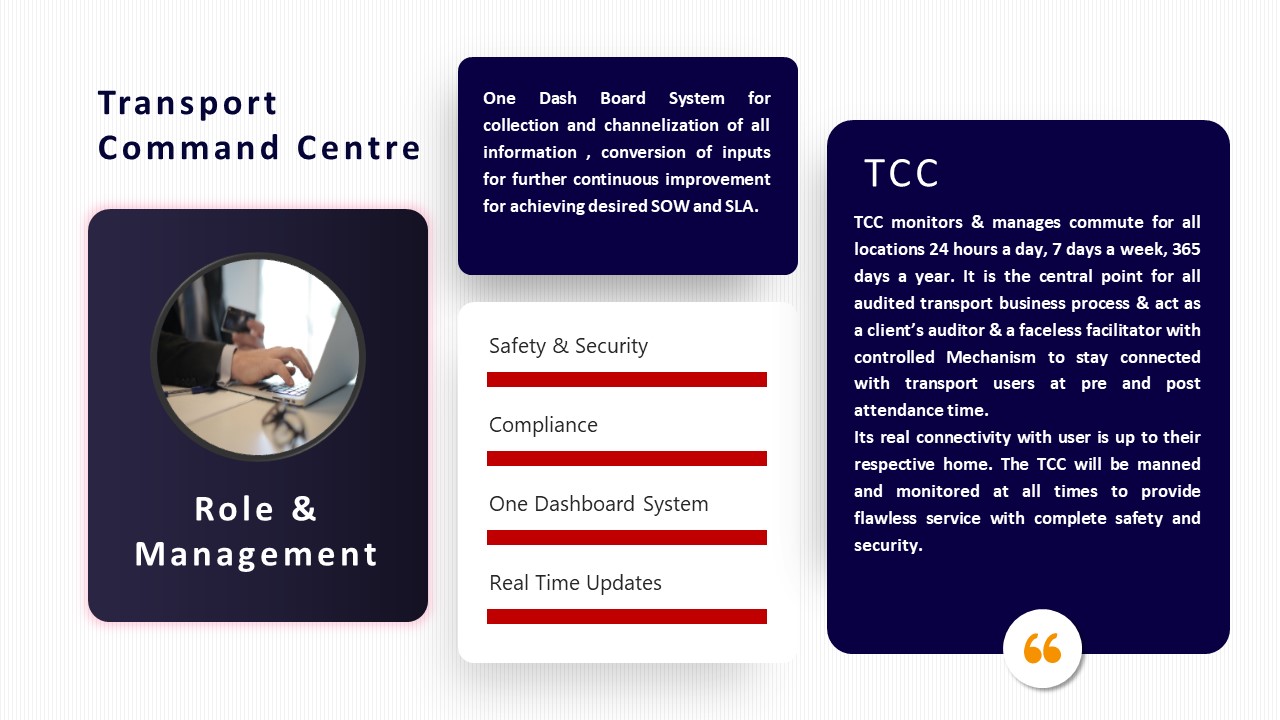 Tier-2 support requires on-ground supervision, not just a remote helpdesk. Strong operators deploy daily shift-wise briefings, local project or event control desks, and a Transport Command Centre or Central Command Centre that monitors trips, alerts, and exceptions in real time. This is reinforced by micro-functioning SOPs for command centers, centralized compliance management, safety and security protocols for employees and women, and HSSE role clarity from leadership down to drivers.